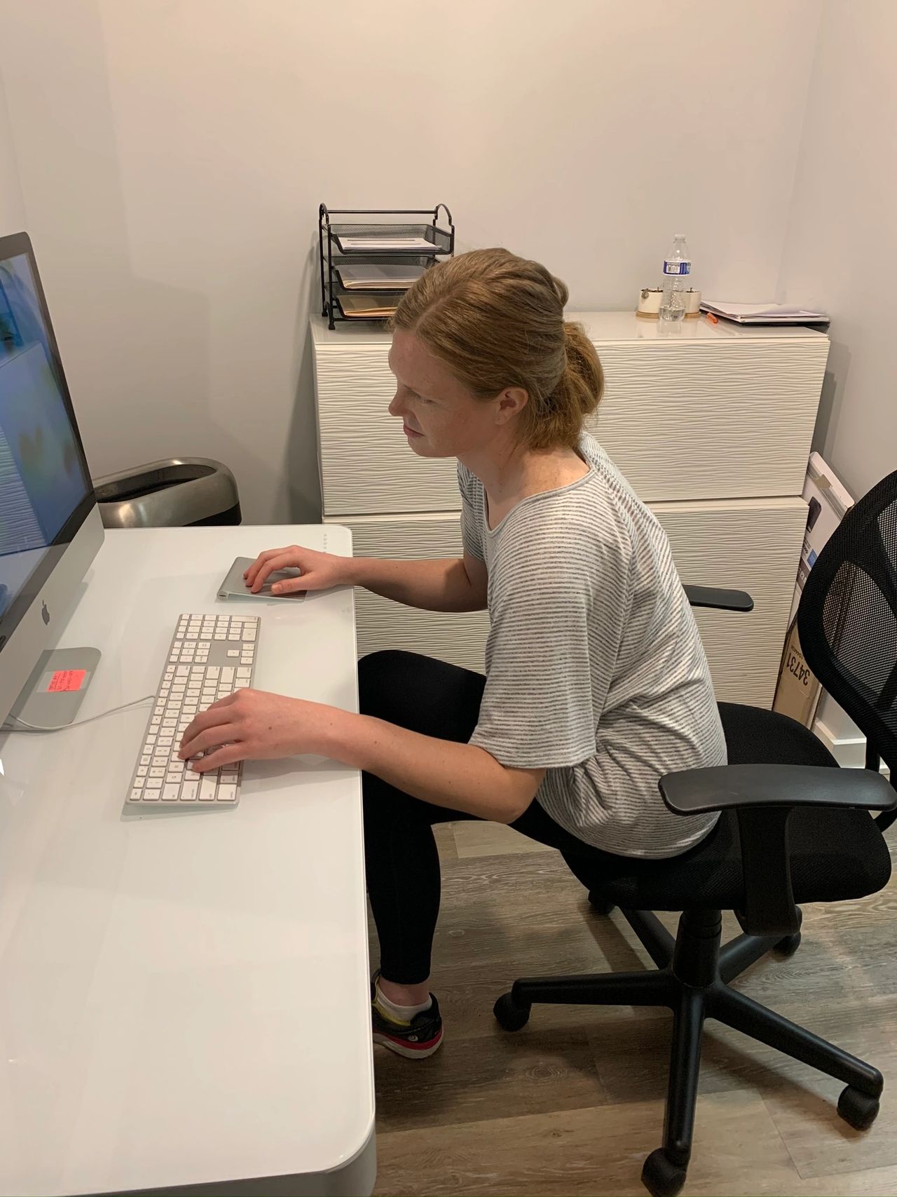 This posture is what I would call a slouched posture, notice there is no low back support, the arms are unsupported and stretch out to reach the keyboard and mouse. Mary also has some forward head posture to help compensate for her slouched position in an attempt to get more midline. This can lead to neck and low back pain, headaches, and numbness and tingling in the arms.